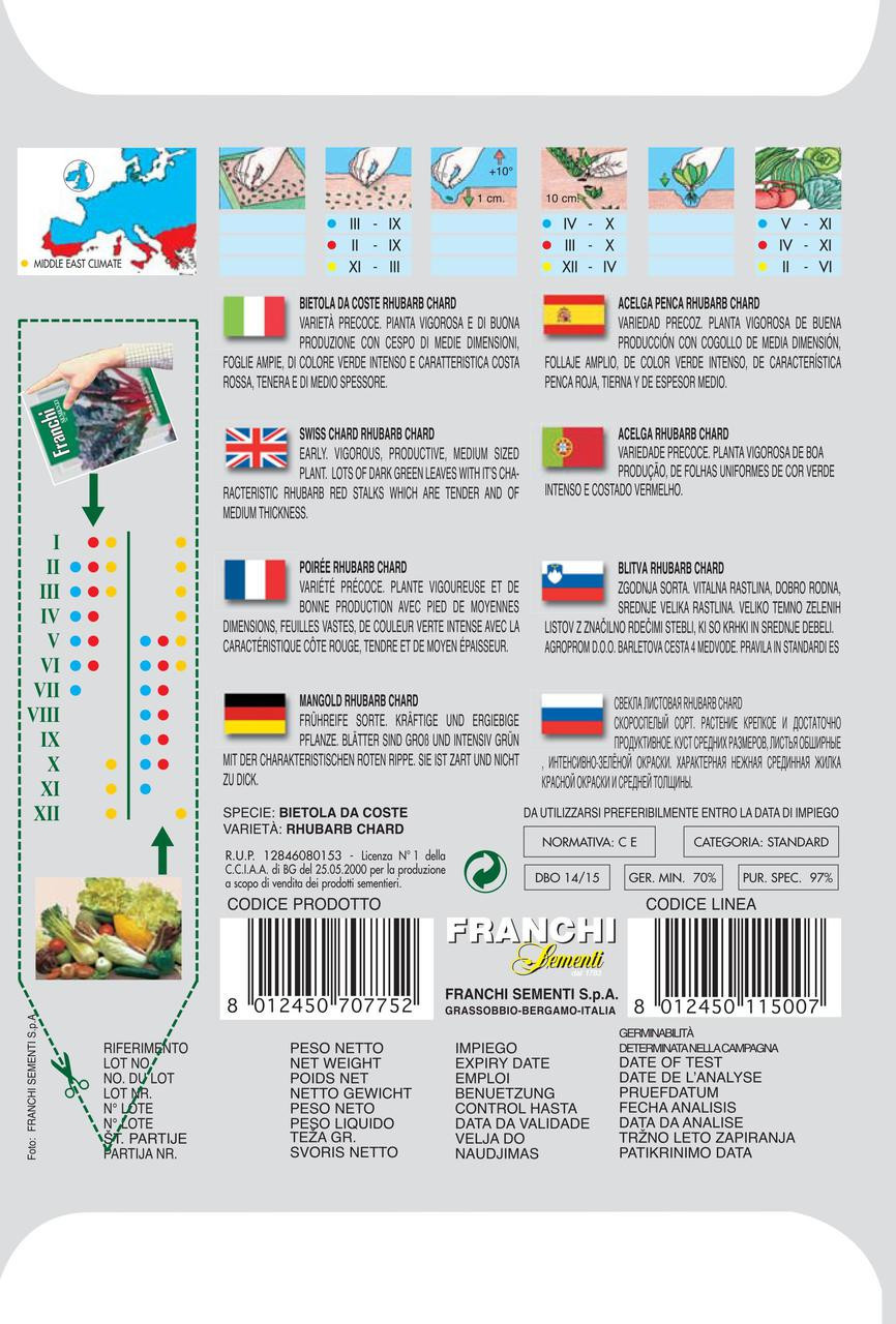 | Attractive red stemmed chard with tasty, soft textured leaves that can be used as for spinach in soups, pasta dishes and as a braised vegetable. Easy to grow and can be progressively picked. Plant direct preferably, or transplant seedlings after the risk of frost. Can be grown all year in warmer climates. 9g about 500 seeds. |