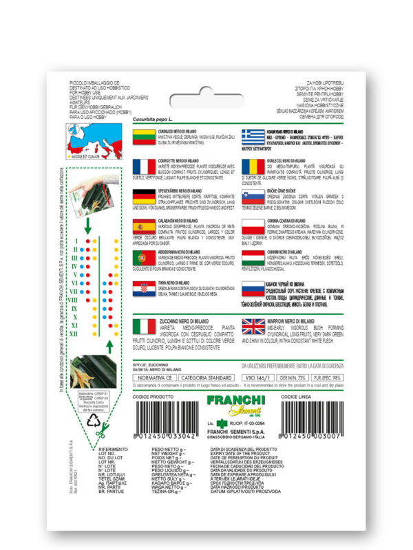 COURGETTE NERO DI MILANO- Mid-early. Vigorous bush forming cylindrical, long fruits, very dark green and shiny in cooler, with a consistent white flesh.